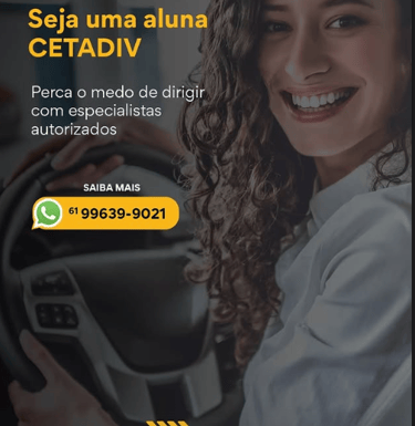 meu nome Eliete moro na M norte tenho 61 anos procurei cetadiv pra pegar umas aulas pra perder o medo de dirigir , tenho a cnh , mas estava com muito medo, encontrei a cetadiv pela internet aonde entrei em cotato e tao logo me atenderao gentilmente fiz meu minha matricula tudo pelo whatssap, no primeiro dia captou todas minhas dificuldades , assim trabalhou todo meu medo , o professor adilson foi muito atencioso e com un profissionslismo sem explicaçao , me fez perder o medo e pude voltar a dirigir por qualquer lugar , por isso super indico e recomendo a cetadiv